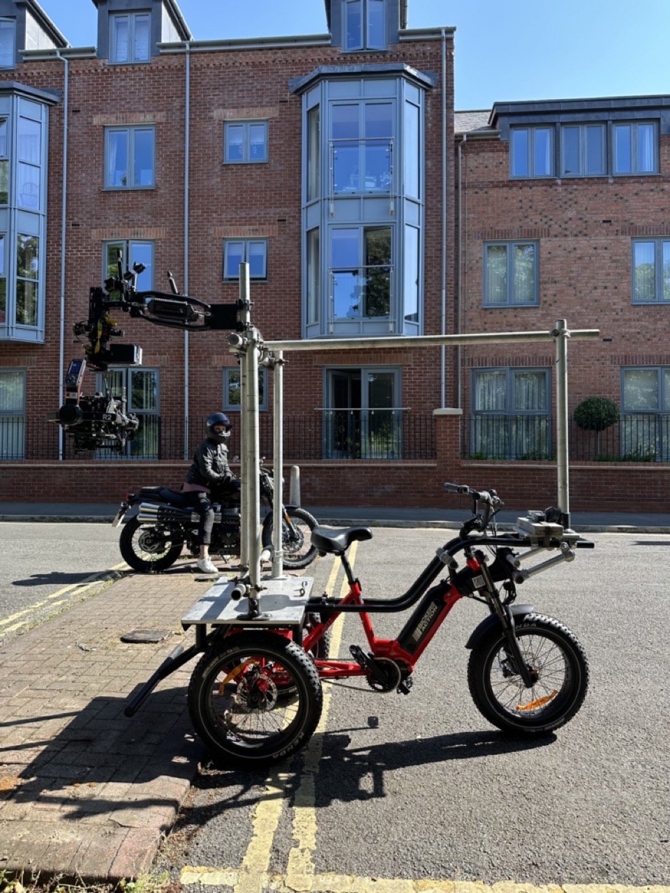 It has been designed and built to be fully compliant with the new E-Bike laws within the UK. This enables it to be used on roads, pavements and anywhere else it is needed, whilst remaining nimble to cater to a range of camera tracking needs. Not advised to be used for stunt interactive vehicle work, The Trojan or Twizzy Tracking vehicles are more suited for this shooting