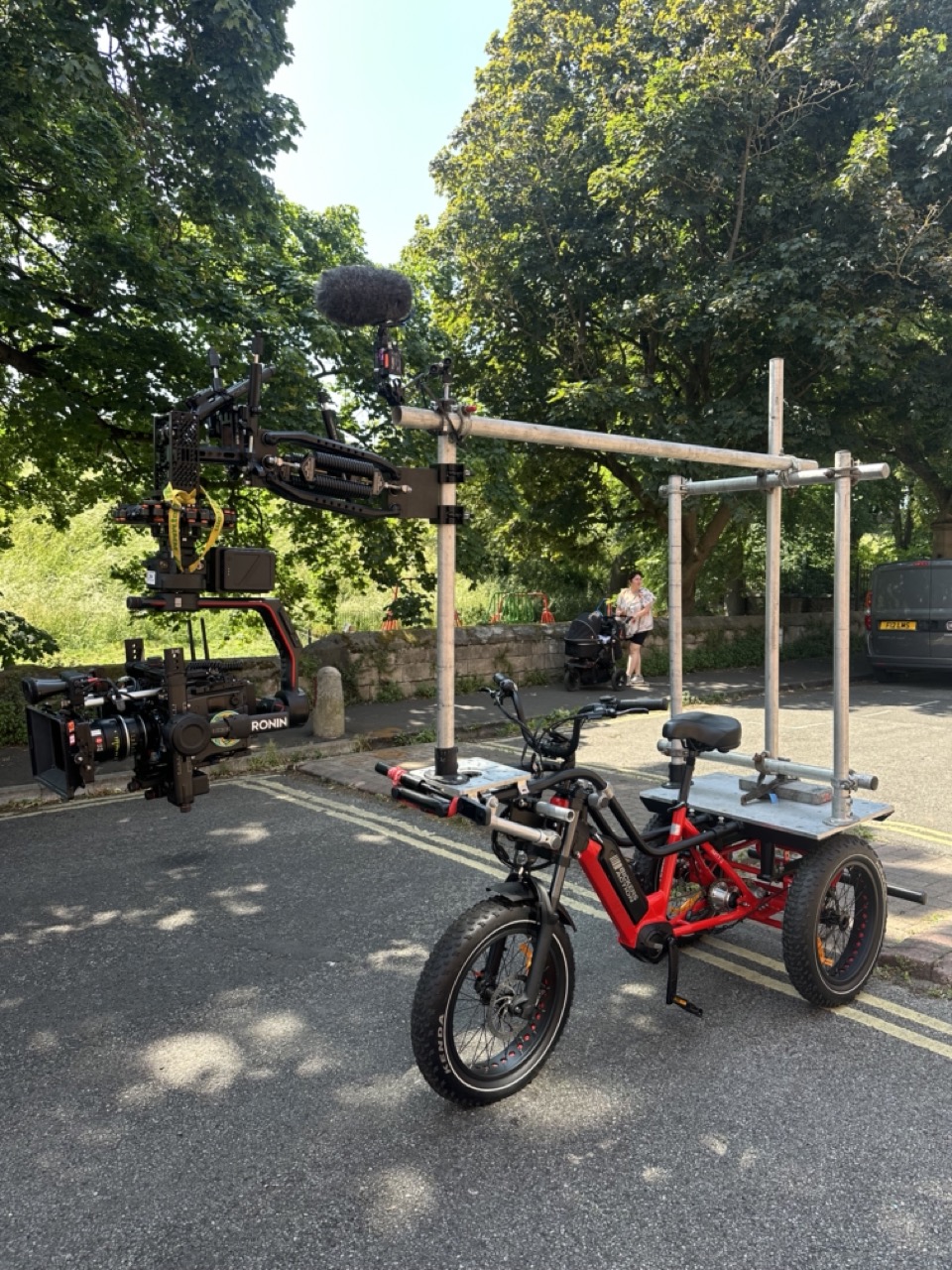 The Bickers E-Trike has been designed and built to allow for a vast range of different camera rigging options. It has a seat on the rear with a footrest which can be used for handheld as well as Steadicam. The multi-purpose plate on the front and rear can be used to rig remote heads such as the Mini Libra, Ronin, Flighthead, and many others.