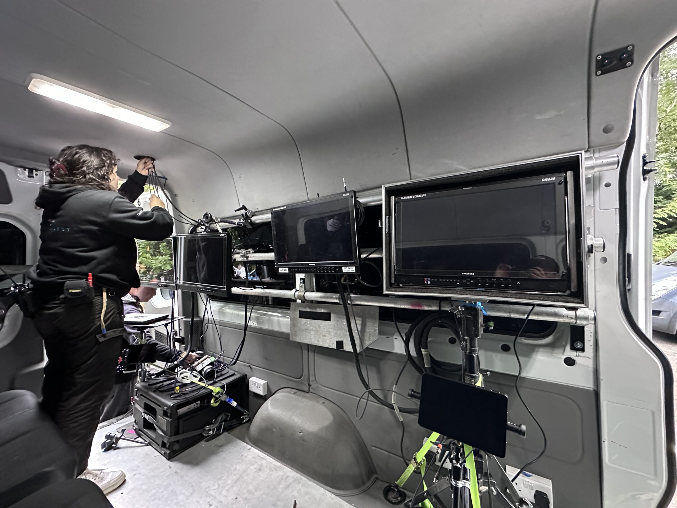 The Video Pursuit Vehicle has been designed to allow the video playback monitoring department to become mobile. This means that not only does this remove the need to set up and strike the video village numerous times throughout the shoot day, it also allows the video village to move instantly, and if required to track along with the action.The custom roof rack and port holes allows the easy rigging of aerials and cables onto the top of the vehicle, to assist with the wireless range of equipment.This also allows wireless remote gyro-stabilized heads mounted on separate tracking vehicles to be operated from the video pursuit vehicle, whilst remaining close to the action sequence, preventing wireless link dropout.